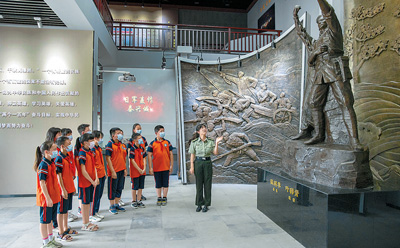 7月6日,在江蘇省泰興市新街鎮(zhèn)楊村廟烈士紀(jì)念館,少先隊(duì)員在宣泰戰(zhàn)斗浮雕前聽(tīng)講解員講解。