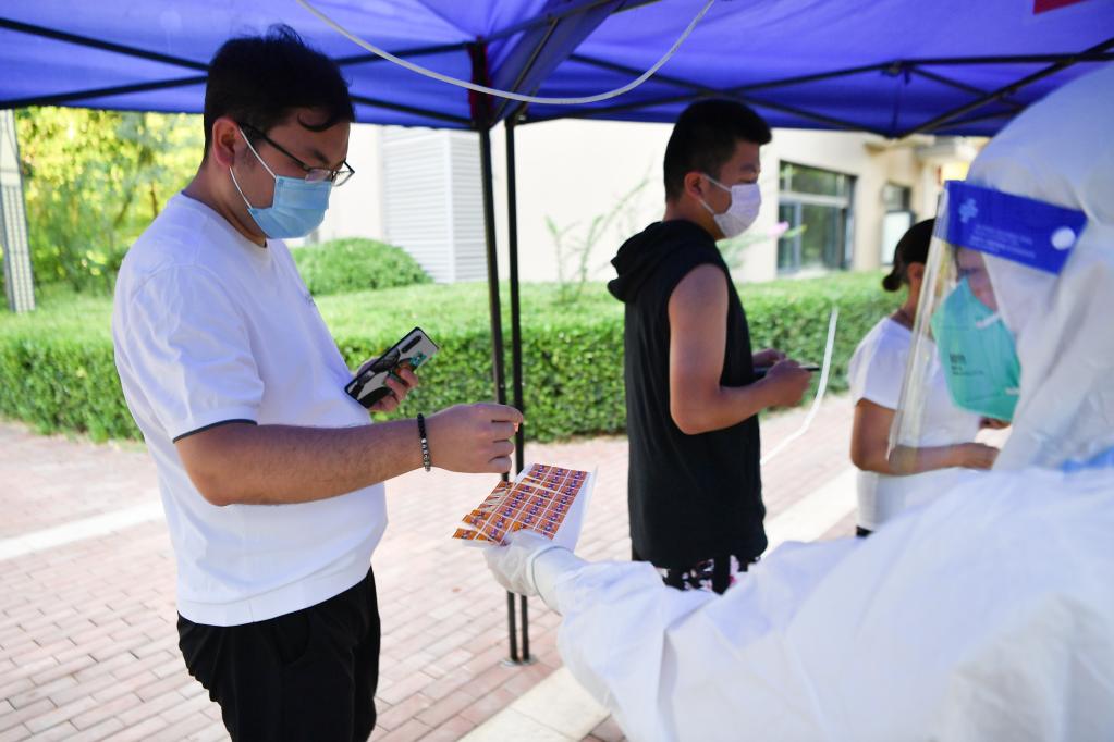 7月8日,志愿者(右)向西安市曲江新區(qū)紫汀苑社區(qū)居民發(fā)放核酸檢測貼紙。新華社記者 張博文 攝