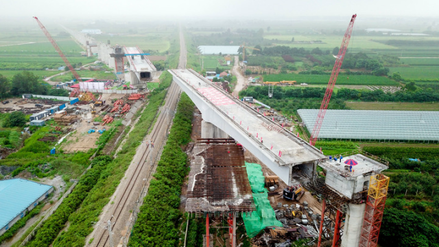 圖為國家重點基建項目濰(坊)煙(臺)高鐵全線重點控制性工程——跨龍煙鐵路超長轉(zhuǎn)體梁成功轉(zhuǎn)體。新華社記者 郭緒雷 攝