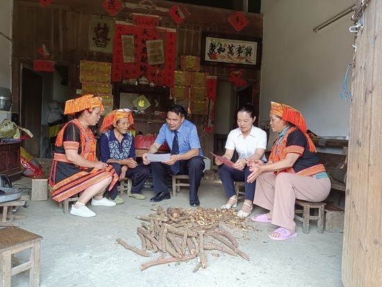 2021年9月28日賴家明(左三)到永??h堡里鎮(zhèn)河?xùn)|村瑤族群眾家中宣傳未成年人保護(hù)法和預(yù)防未成年人犯罪法。永福縣人民檢察院供圖