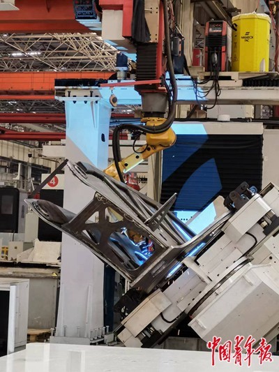 在三一18號工廠里,機(jī)器人正在對工件進(jìn)行焊接作業(yè)。中青報·中青網(wǎng)記者 洪克非/攝