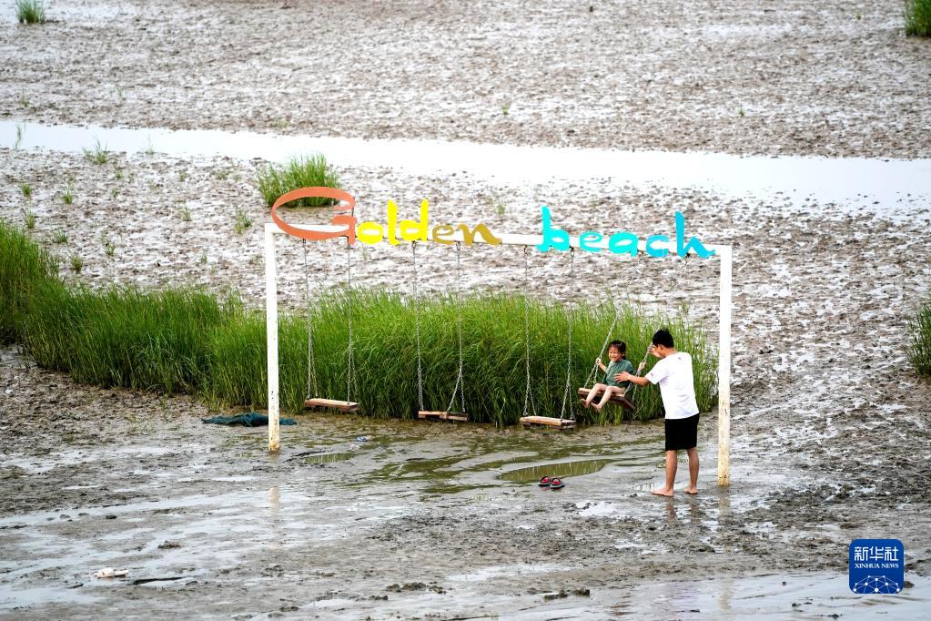 游人在江蘇省啟東市黃金海灘景區(qū)內的黃海灘涂上休閑娛樂(2022年7月16日攝)。新華社記者 季春鵬 攝