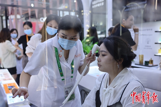 7月26日,海南??冢诙弥袊?guó)國(guó)際消費(fèi)品博覽會(huì)法國(guó)館一家護(hù)膚品品牌展位上,關(guān)注科技美膚的女性參觀者排隊(duì)體驗(yàn)AI智能測(cè)膚儀。這款測(cè)膚儀可實(shí)時(shí)顯示放大30倍的毛孔并發(fā)送檢測(cè)報(bào)告。