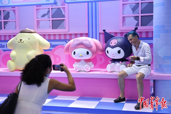 7月25日,海南海口,第二屆中國(guó)國(guó)際消費(fèi)品博覽會(huì)服務(wù)消費(fèi)展區(qū)內(nèi),外國(guó)參觀者與三麗鷗展位的卡通形象展品合影。許多人認(rèn)為,女性消費(fèi)能力提升是卡通形象IP流行的原因之一。