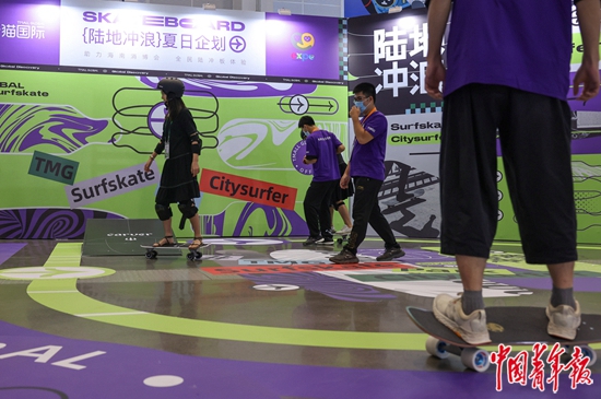7月26日,海南??冢诙弥袊?guó)國(guó)際消費(fèi)品博覽會(huì)上,一家參展商在進(jìn)行陸地沖浪教學(xué)活動(dòng)。陸地沖浪是當(dāng)下十分受年輕人喜愛的一種運(yùn)動(dòng),尤其在疫情背景下,年輕人紛紛擁抱戶外運(yùn)動(dòng),陸地沖浪不僅是一種鍛煉,更具備社交功能。