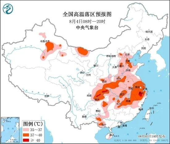 中央氣象臺預(yù)計,8月4日白天,陜西南部、河北中南部、北京、天津、山東、河南、安徽、江蘇、上海、湖北、湖南中北部、江西中北部、浙江、福建西北部、四川東部、重慶、貴州東部、廣西西部等地有35℃以上的高溫天氣,其中,陜西南部、河北東部和南部、天津南部、山東北部、河南西南部和東部、安徽南部、江蘇中南部、上海、湖北東部和西部、湖南北部和東部、江西中北部、浙江、四川東部、重慶、貴州東北部、廣西西南部等地部分地區(qū)最高氣溫37~39℃,浙江中北部、重慶局地可達(dá)40℃以上。