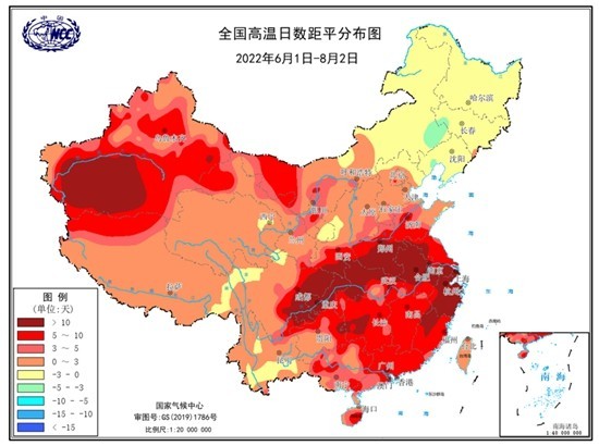 2022年6月1日-8月2日全國高溫日數(shù)距平(單位:天)