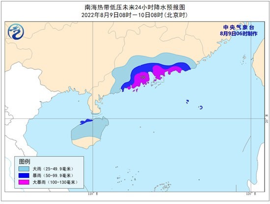 降水預(yù)報(bào):8月9日08時(shí)至10日08時(shí),廣東南部和海南島等地部分地區(qū)有大到暴雨,其中廣東南部沿海有大暴雨(100-130毫米)。