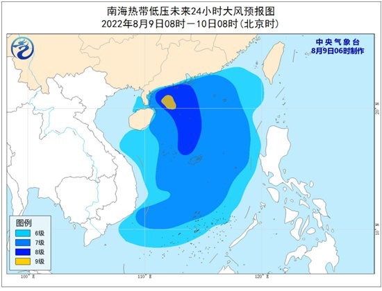 大風(fēng)預(yù)報(bào):8月9日08時(shí)至10日08時(shí),南海大部海域、瓊州海峽、北部灣東部海面和廣東沿海、海南島東部沿海、以及南沙群島附近海域、西沙群島附近海域、中沙群島附近海域?qū)⒂?-7級(jí)風(fēng),低壓或風(fēng)暴中心附近海域風(fēng)力可達(dá)8-9級(jí)、陣風(fēng)10級(jí)。