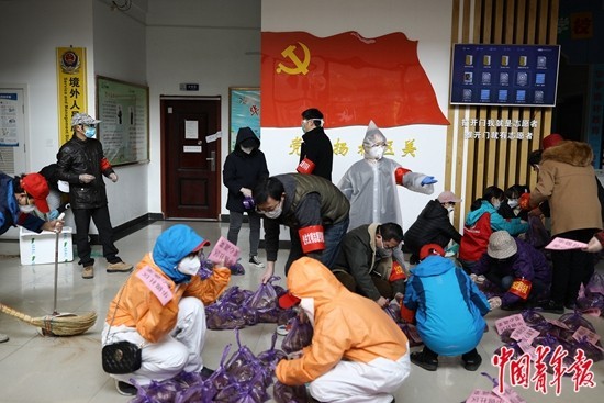 2020年2月23日,湖北省武漢市華錦花園小區(qū),參加疫情防控服務的志愿者在整理準備送給住戶的菜品。中青報·中青網(wǎng)記者 趙迪/攝