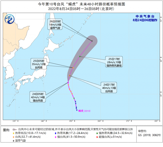 “蝎虎”將以每小時(shí)20公里左右的速度向北偏東方向移動(dòng),強(qiáng)度緩慢減弱,并將于26日逐漸變性為溫帶氣旋。未來“蝎虎”對(duì)我國(guó)無影響。
