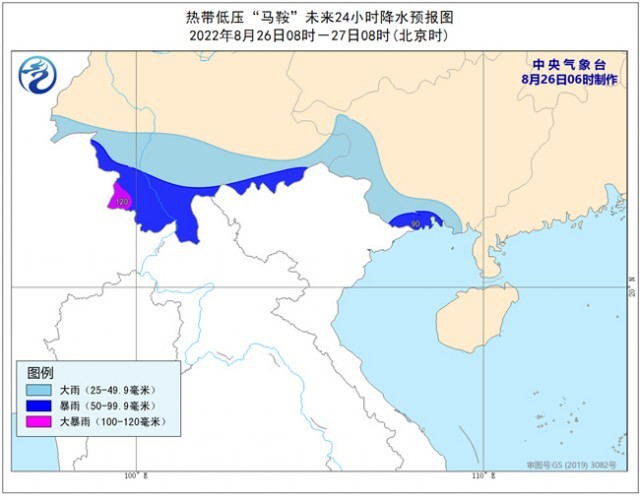 預計26日08時到27日08時,北部灣、南海西部、西沙群島附近海域、海南島東部沿海仍將有6-7級大風,陣風可達8級。廣西南部和西部、云南南部將有大到暴雨,其中云南西南部的部分地區(qū)有大暴雨(100-120毫米)。