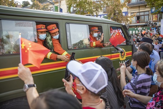 8月28日,重慶市北碚區(qū),森林消防隊員向前來送別的群眾比心。