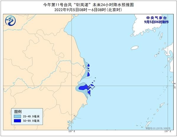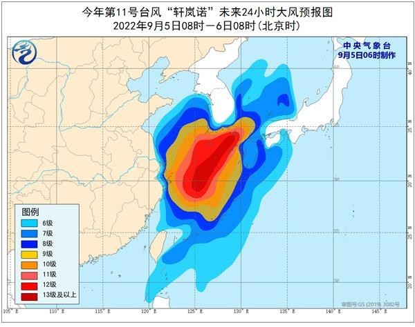 大風(fēng)預(yù)報:9月5日8時至6日8時,巴士海峽、臺灣以東洋面、東海、黃海中部和南部、釣魚島附近海面、長江口區(qū)、杭州灣、臺灣島沿海、浙江東北部、上海、江蘇東部及沿海將有6—9級大風(fēng),陣風(fēng)10—11級,其中東海大部、黃海南部、杭州灣、浙江東北部沿海的風(fēng)力有10—12級,陣風(fēng)11—13級,“軒嵐諾”中心經(jīng)過的附近海面的風(fēng)力有13—16級,陣風(fēng)可達17級及以上。