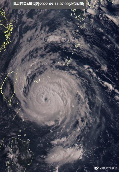 9月11日凌晨,“梅花”加強(qiáng)為強(qiáng)臺風(fēng)級,臺風(fēng)眼清晰可見。@中央氣象臺