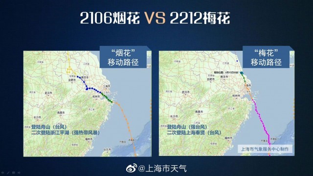2106號臺風(fēng)“煙花”和2212號臺風(fēng)“梅花”路徑對比。@上海市天氣