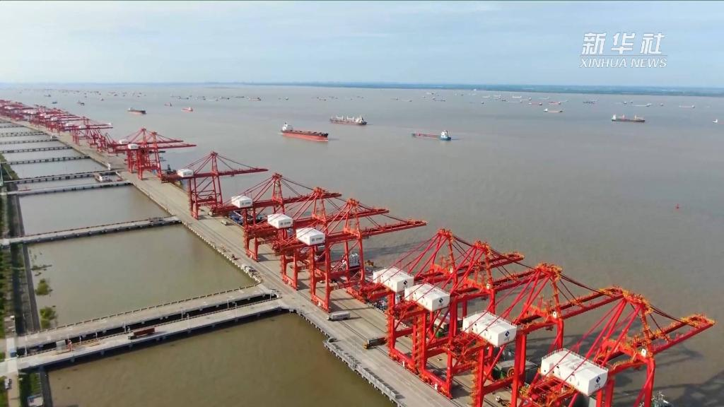 江蘇蘇州太倉港位于長(zhǎng)江入海口南岸。太倉港四期碼頭岸邊,巨型岸橋依次排開,為江上??康呢涍\(yùn)船只提供裝卸服務(wù)。