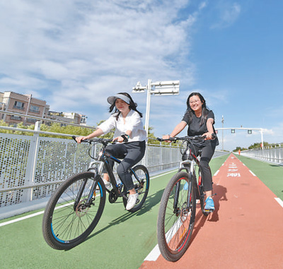 綠色生活創(chuàng)建行動全面推進(jìn),節(jié)約型機(jī)關(guān)、綠色家庭、綠色學(xué)校、綠色社區(qū)、綠色出行、綠色商場、綠色建筑等創(chuàng)建行動深入開展,重點領(lǐng)域消費綠色轉(zhuǎn)型成效顯著。圖為北京市民在自行車專用路上騎行。 |