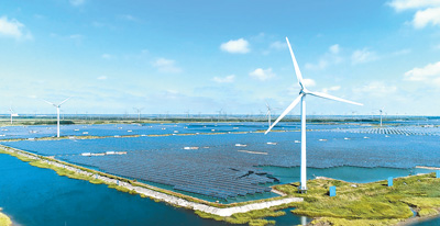 2021年,全國可再生能源裝機(jī)規(guī)模突破10億千瓦,風(fēng)電、光伏發(fā)電裝機(jī)均突破3億千瓦,水電、風(fēng)電、光伏發(fā)電、生物質(zhì)發(fā)電裝機(jī)均居世界第一;新能源發(fā)電量突破1萬億千瓦時。圖為江蘇省東臺市“風(fēng)光漁”互補(bǔ)產(chǎn)業(yè)基地。 |