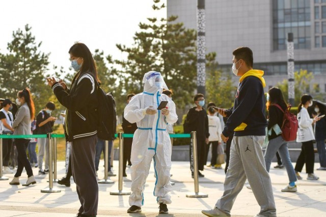 10月2日,在吉林省長春市一處便民核酸檢測(cè)點(diǎn),工作人員為前來進(jìn)行核酸檢測(cè)的市民掃碼登記。新華社記者 許暢 攝