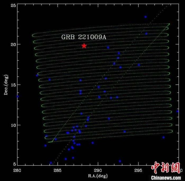 “慧眼”衛(wèi)星觀測(cè)迄今最亮的伽馬射線暴GRB 221009A,綠色點(diǎn)線代表望遠(yuǎn)鏡指向的掃描軌跡。 中科院高能所 供圖