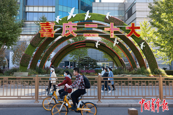 10月18日,北京東長安街,行人從“喜慶二十大”的花壇前經(jīng)過。中青報·中青網(wǎng)記者 曲俊燕/攝