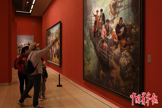 10月11日,北京,中國美術(shù)館,一家人在油畫《天梯》前駐足觀看。這幅作品描繪的四川大涼山“懸崖村”,是脫貧攻堅偉大成就的代表性縮影。中青報·中青網(wǎng)記者 孔斯琪/攝