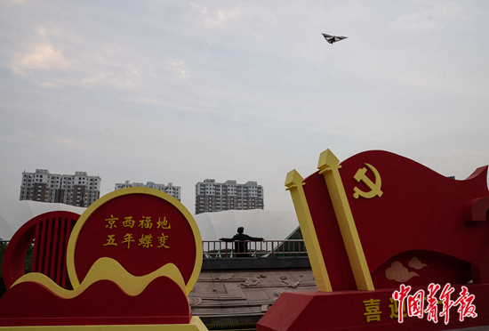 在市民常去散步休閑的北京國際雕塑公園一角,也為迎接黨的二十大召開設(shè)立了發(fā)展成就展覽。附近的居民推著嬰兒車、孩子踩著輪滑鞋、大爺放著風箏,在印滿笑臉的展板和黨旗飄揚的雕塑之間穿行。