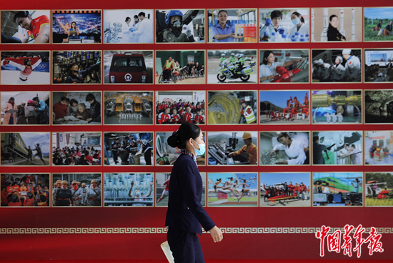 10月11日,北京,中國婦女兒童博物館,工作人員從反映各行業(yè)女性勞動者代表的照片墻前經(jīng)過。近日,“新時代的婦女兒童——中國婦女兒童事業(yè)發(fā)展十年成就展”在這里舉行。展覽通過500多幅照片和近百件實物,展現(xiàn)了10年來婦女兒童事業(yè)取得的碩果。中青報·中青網(wǎng)記者 陳劍/攝