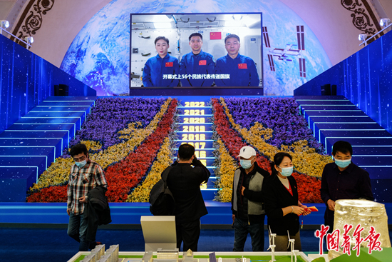 近日,參觀者在“奮進新時代”主題成就展上觀看展示我國航空航天成就的展品,屏幕上播放著神舟十四號航天員在空間站送出的國慶節(jié)祝福影像。中青報·中青網(wǎng)記者 趙迪/攝