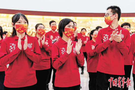 10月1日,中國共產(chǎn)黨歷史展覽館,來自清華大學的120余名師生在館內(nèi)參觀。中青報·中青網(wǎng)記者 李雋輝/攝