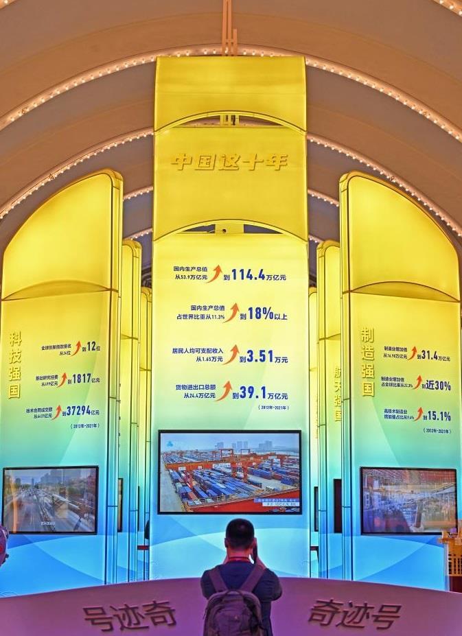 新時代10年,我國經(jīng)濟實力實現(xiàn)歷史性躍升,國內(nèi)生產(chǎn)總值從54萬億元增長到114萬億元,經(jīng)濟總量占世界經(jīng)濟的比重達18.5%,提高7.2個百分點,穩(wěn)居世界第二位;人均國內(nèi)生產(chǎn)總值從39800元增加到81000元。