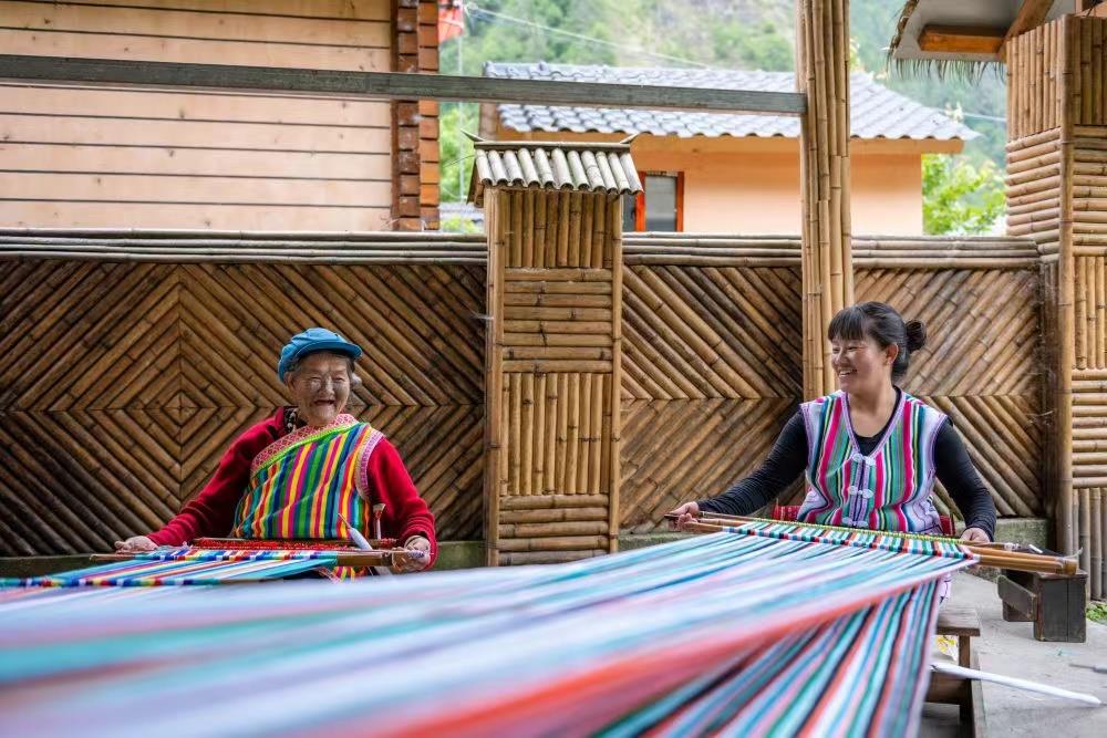 △云南怒江貢山縣獨龍江鄉(xiāng)獨龍族老人李文仕(左)和女兒在編織獨龍?zhí)骸?/span>