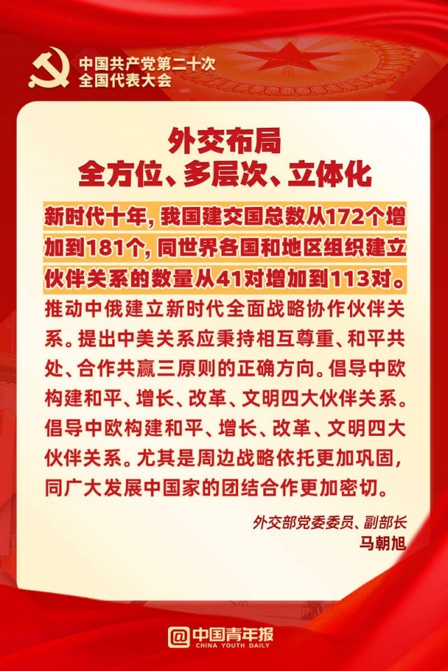 新時(shí)代十年,我國建交國總數(shù)增加到181個(gè);中國共產(chǎn)黨同世界上600多個(gè)政黨和政治組織保持著不同形式的聯(lián)系;中國同26個(gè)國家和地區(qū)簽署了19個(gè)自貿(mào)協(xié)定……今天,黨的二十大新聞中心舉行第四場記者招待會,一起來了解中國特色大國外交開拓前行這十年。