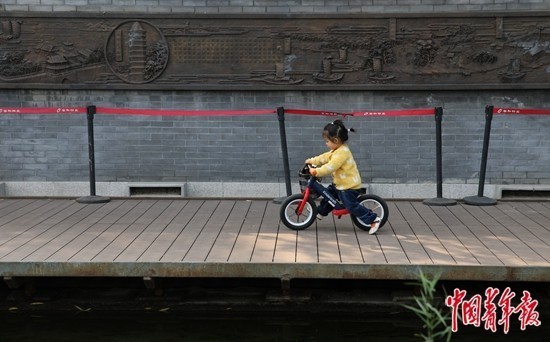 2022年10月25日,北京玉河遺址公園,一個(gè)小朋友從濃縮展示1700多公里京杭大運(yùn)河沿岸風(fēng)光的《京杭大運(yùn)河風(fēng)物圖》浮雕畫卷前經(jīng)過(guò)。玉河始建于公元1292年,曾作為大運(yùn)河千里漕運(yùn)的最后一段在胡同中蜿蜒。中青報(bào)·中青網(wǎng)記者 陳劍/攝