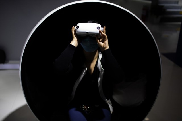 在第四屆進(jìn)博會(huì)技術(shù)裝備展區(qū),參觀者在體驗(yàn)超臨場(chǎng)感3D虛擬視頻(2021年11月7日攝)。新華社記者 金立旺 攝