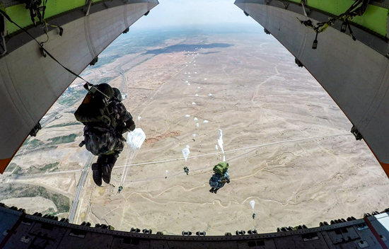 傘兵從運(yùn)輸機(jī)尾門躍出機(jī)艙。陳立春/攝
