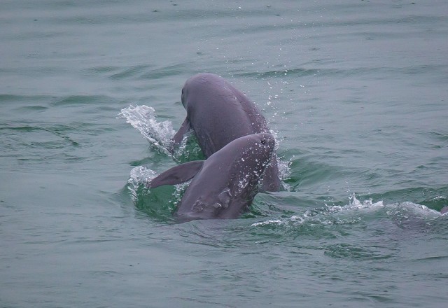 在湖北省宜昌市江邊,長江江豚在水中嬉戲(2021年5月10日攝)。新華社記者 肖藝九 攝
