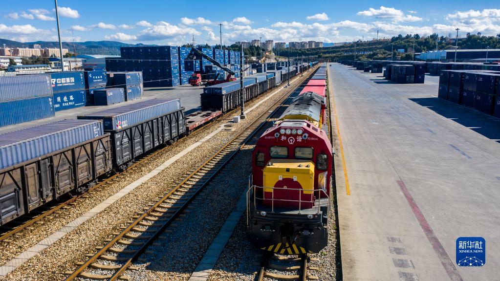 滿載30個標(biāo)準(zhǔn)集裝箱的中老鐵路新年首趟國際貨物列車??吭谥需F聯(lián)集昆明中心站(2022年1月1日攝,無人機照片)。新華社記者 胡超 攝