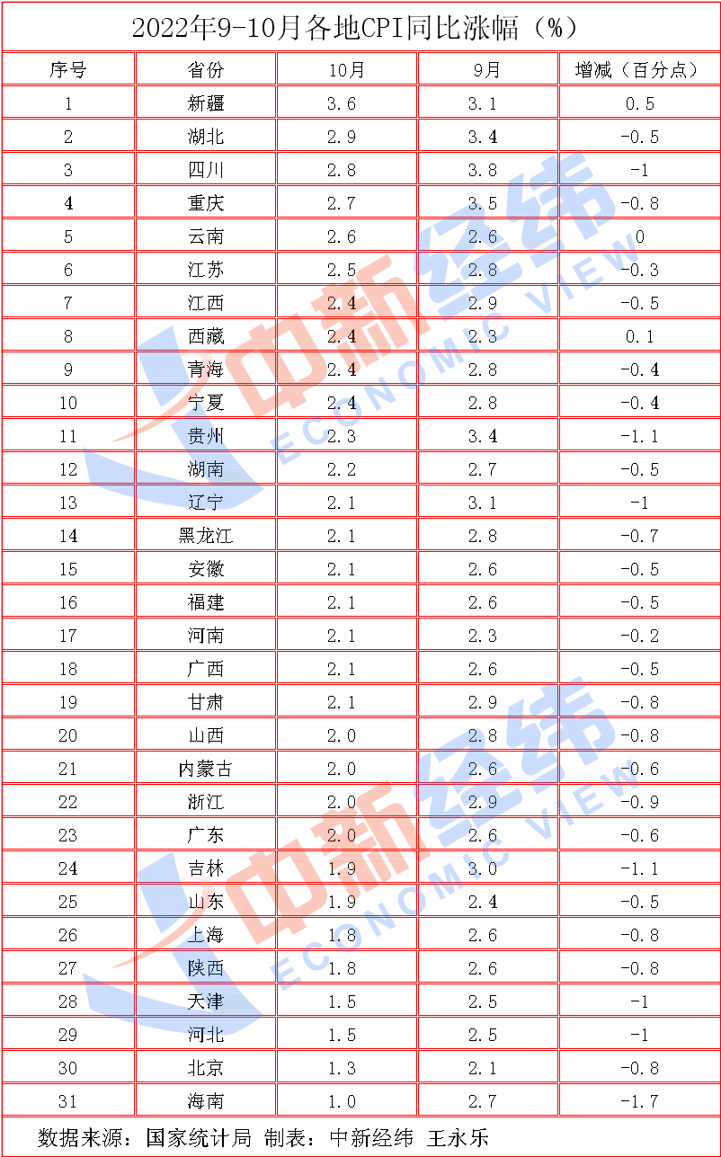 日前,國家統(tǒng)計(jì)局公布了31省份2022年10月居民消費(fèi)價(jià)格指數(shù)(CPI)。中新經(jīng)緯梳理發(fā)現(xiàn),10月,28省份CPI同比漲幅低于上月。其中,新疆最高為漲3.6%,海南最低漲1.0%。
