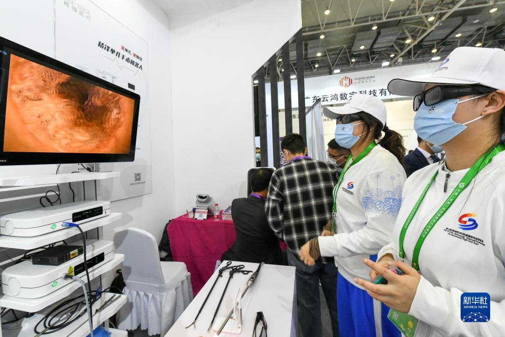 11月16日,在第十屆中國(綿陽)科技城國際科技博覽會(huì)上,志愿者佩戴特殊眼鏡觀看3D電子內(nèi)窺鏡屏幕。