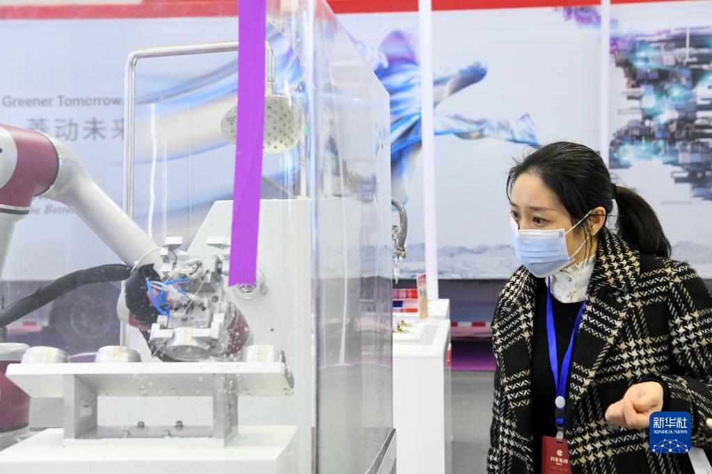 11月16日,在第十屆中國(綿陽)科技城國際科技博覽會(huì)上,觀眾觀看柔性智能機(jī)器人作業(yè)。