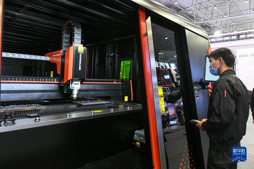 11月16日,在第十屆中國(綿陽)科技城國際科技博覽會(huì)上,參展商在示范操作特高功率激光切割機(jī)。