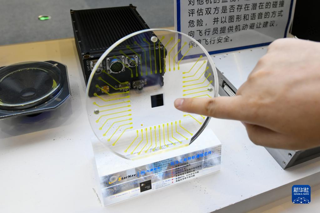 這是在第十屆中國(綿陽)科技城國際科技博覽會(huì)展會(huì)現(xiàn)場展出的北斗三號(hào)導(dǎo)航通信芯片(11月16日攝)。