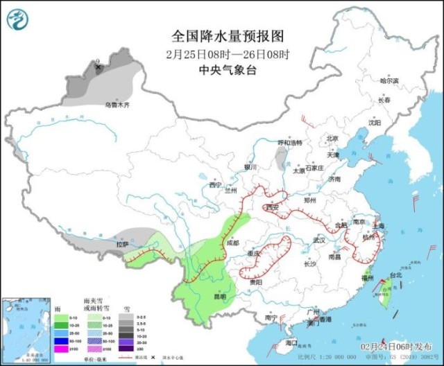 全國降水量預(yù)報圖(2月24日08時-25日08時)。圖片來源:中央氣象臺網(wǎng)站