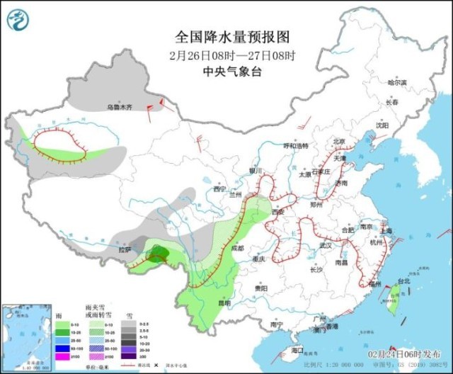 全國降水量預(yù)報圖(2月26日08時-27日08時)。