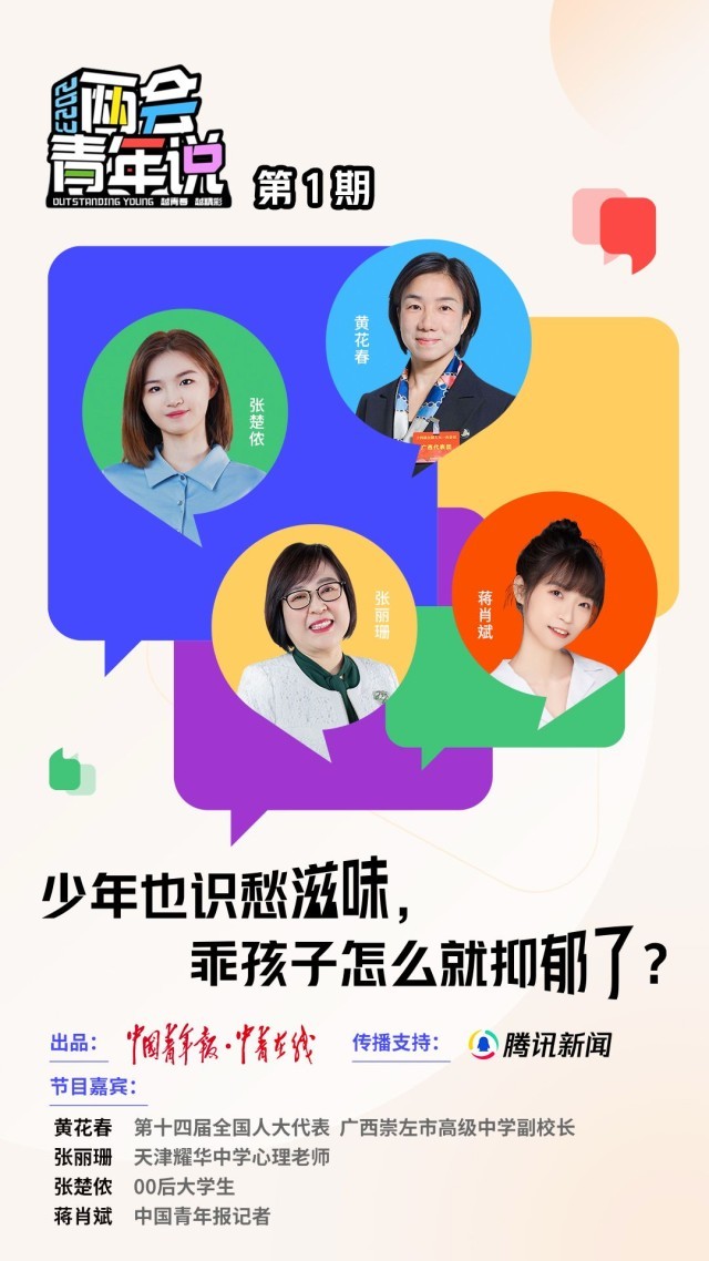 2023年《兩會(huì)青年說》第1期,00后大學(xué)生張楚儂和天津耀華中學(xué)心理老師張麗珊來到節(jié)目錄制現(xiàn)場,第十四屆全國人大代表、廣西崇左市高級(jí)中學(xué)副校長黃花春,在“青春宇宙會(huì)客廳”內(nèi),通過全息投影技術(shù)和現(xiàn)場互動(dòng)連線。嘉賓們針對青少年心理健康問題展開討論,呼吁家庭、學(xué)校、社會(huì)等多方面形成合力,關(guān)注孩子的心理健康成長。