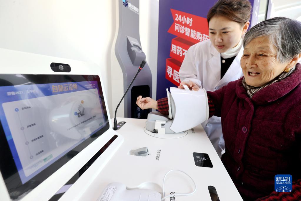 在浙江省湖州市德清縣阜溪街道興山未來社區(qū)居家養(yǎng)老服務中心,家庭醫(yī)生輔助社區(qū)老人進行云問診(2023年2月16日攝)。新華社發(fā)(謝尚國 攝)