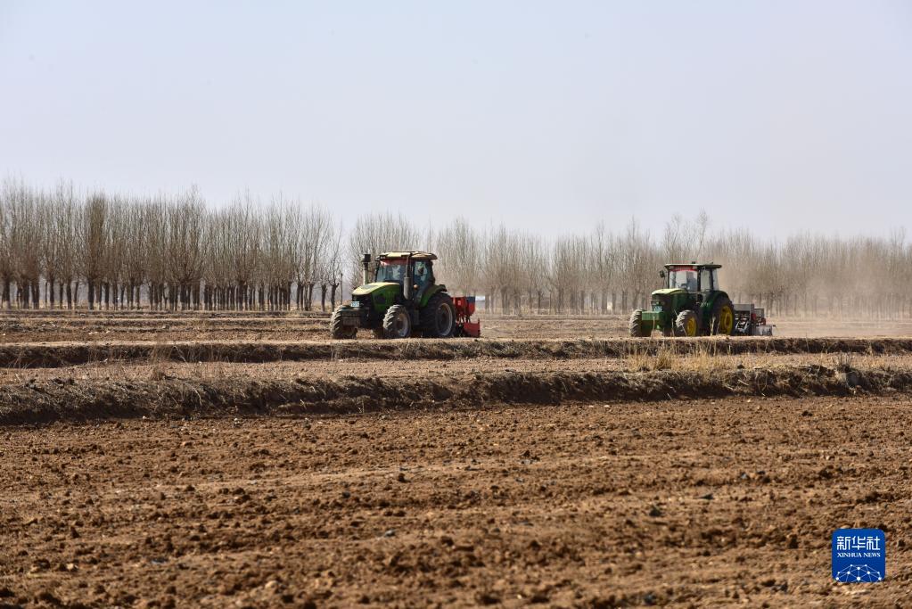 在寧夏銀川市賀蘭縣立崗鎮(zhèn)蘭星村,農(nóng)民駕駛農(nóng)機播種春小麥(2023年3月3日攝)。新華社記者 李旭倫 攝