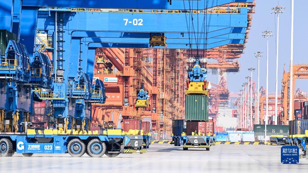 在廣西欽州港自動化集裝箱碼頭,無人駕駛車輛在轉(zhuǎn)運集裝箱(2023年2月25日攝)。新華社記者 張愛林 攝